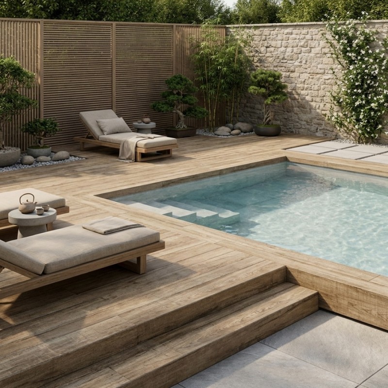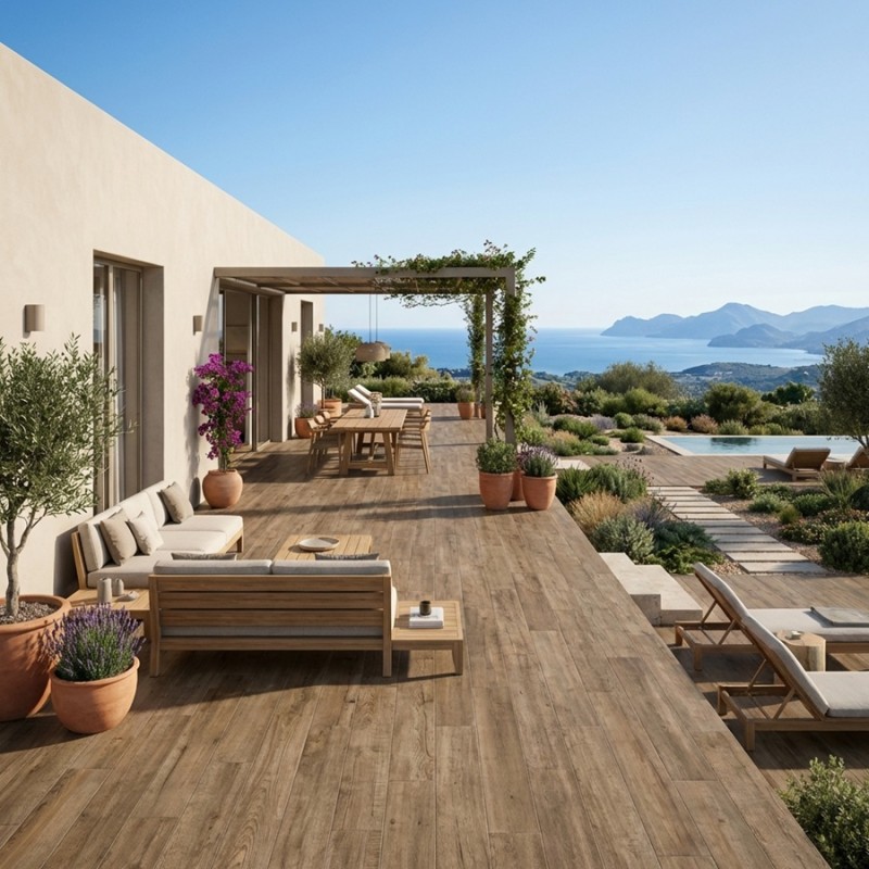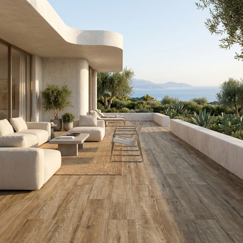 Contrairement au bois naturel, ce carrelage extérieur ne nécessite aucun traitement, ne grise pas, ne se déforme pas et reste très simple d’entretien.