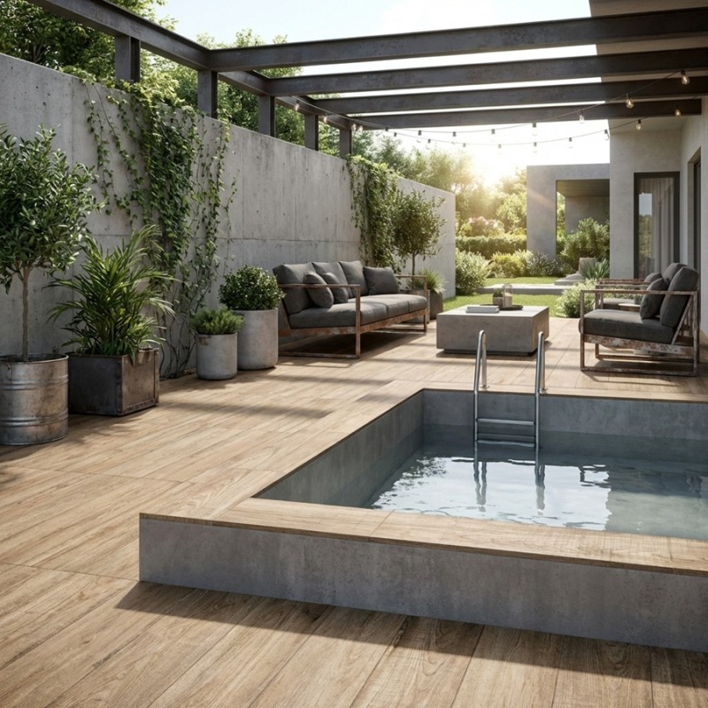 Avec son format 22,5x90 façon lame de parquet, ce revêtement permet une pose droite ou décalée, idéale pour donner du rythme au sol extérieur. Ce style s’adapte parfaitement à une terrasse conviviale, un espace détente, une cuisine d’été ou un extérieur inspiré du style maison de campagne ou chalet moderne.