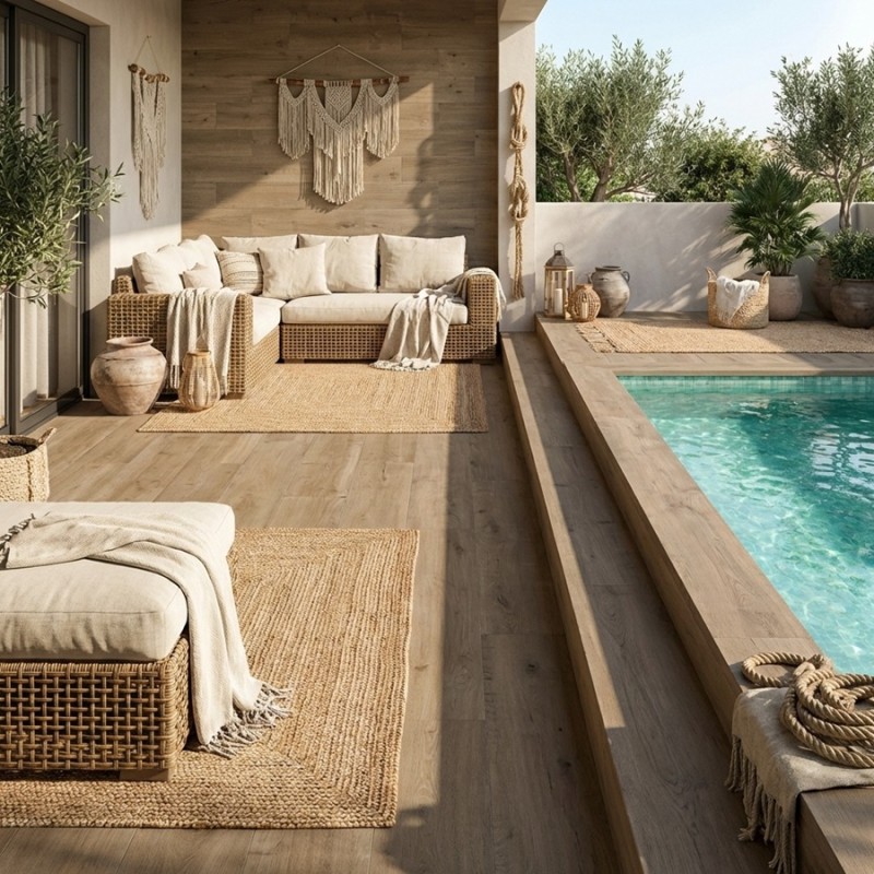 Grâce à sa finition antidérapante R11, il convient parfaitement aux terrasses extérieures, plages de piscine, escaliers et zones exposées à l’eau. Son format 20×120 renforce l’effet lame continue et permet différentes poses : droite, décalée ou en chevron, pour un rendu encore plus haut de gamme.