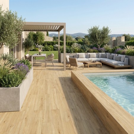 Le carrelage Haru Miel est disponible pour créer des espaces extérieurs chaleureux et accueillants. Associé à du bois, de la pierre naturelle ou du mobilier aux teintes claires, il valorise l’esthétique de votre terrasse.