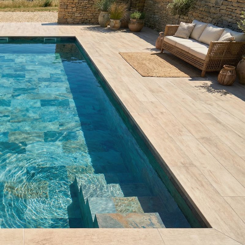Pour un projet cohérent (et franchement plus impactant visuellement), l’idéal est de penser “ensemble” : margelle + carrelage intérieur du bassin + carrelage antidérapant de plage.