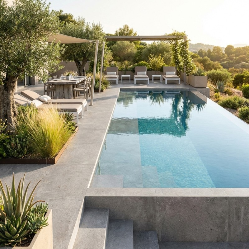 Sa couleur beige-gris sublime les reflets de l’eau, tandis que son aspect pierre naturelle évoque les piscines de Bali.