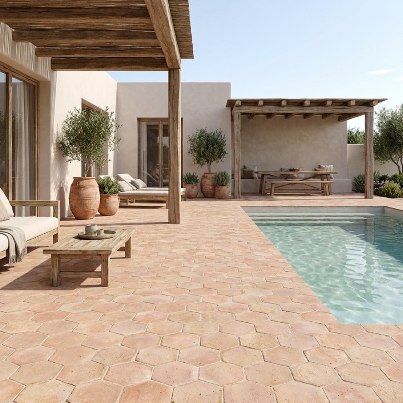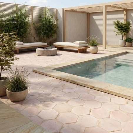 Tomette hexagonale en terre cuite authentique, idéale pour un sol intérieur ou extérieur au charme ancien et naturel, parfaite pour un projet de rénovation ou de maison moderne, existe aussi en format carré 30x30 cm