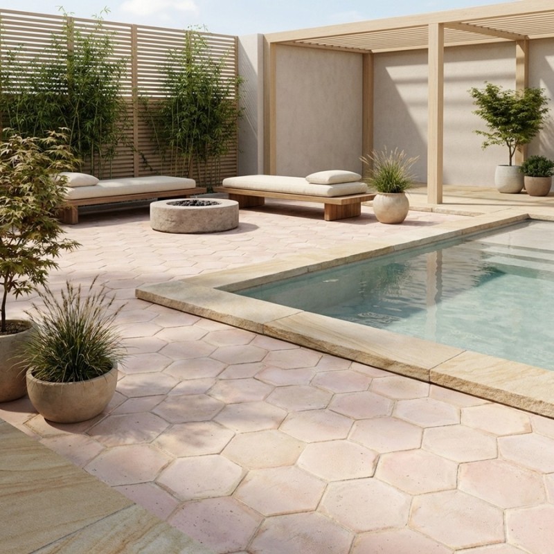 En extérieur, elle sublime un patio végétalisé ou une terrasse naturelle. Le mélange avec un carrelage carré ou des matériaux bruts peut aussi créer un contraste très esthétique dans un projet de rénovation.