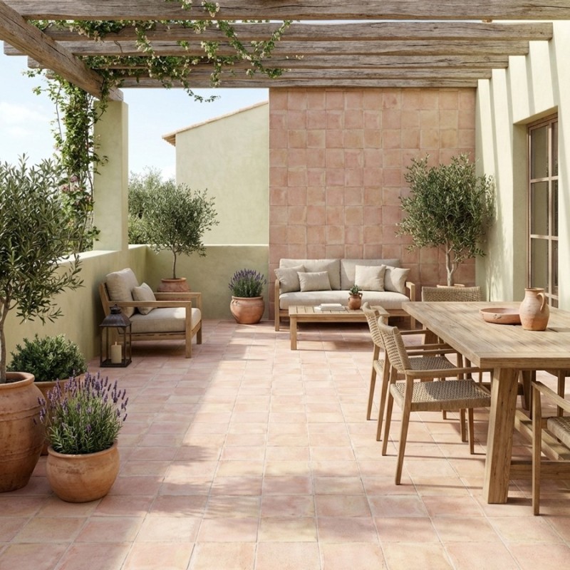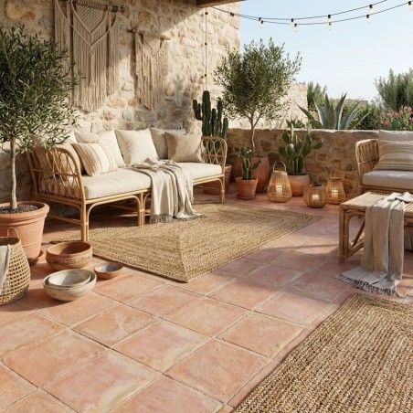 Véritable terre cuite d’Andalousie faite à la main, au charme authentique et aux nuances naturelles, idéale pour des sols de caractère ; existe également en format tomette 20×20 cm.