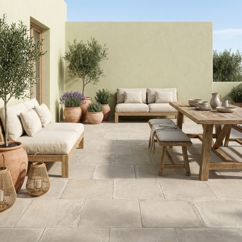 Associez ce carrelage à des meubles en métal ou en bois sombre pour un effet contemporain. Des accessoires en céramique et des plantes en pot viendront compléter cet ensemble chic et moderne. Le carrelage CLOS CENERE antidérapant transforme vos espaces extérieurs en lieux sûrs et stylés.